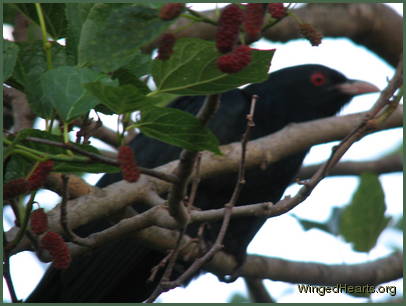The cuckoo birds around our yard are intrigued by the friendship other birds have with us and have been forthcoming in making friends with us too. The female koel (left) was hiding in the mulberry bush, hoping the crows would lose interest. But when I spoke to her and asked her to come out for a shot, she shyly obliged. Not only did she come out and pose for the camera, but stayed for a quite a while overcoming her nervousness and anxiety of humans and crows. Her male friend (below) would hide in the tree and make his mating calls incessantly for weeks. He needed more encouragement, but eventually did let me take some shots before finding a partner.