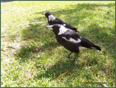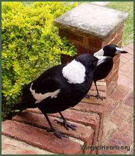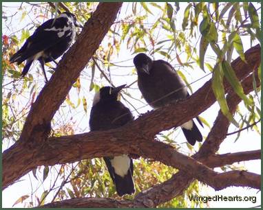 It all started when I was woken this morning by my Magpies calling. I knew something was wrong but when I opened the front door I couldn’t see them anywhere. I went to my office & looked out the window which gives me a better view of our street. There across the road was Daddy Maggie on the ground flapping his wings, trying to fly & his mate Mummy Magpie was yelling at him to “Come on, Get Up Off The Ground”. I quickly grabbed a towel, told my hubby to get out of bed & we went to help. Daddy Maggie couldn’t walk at all, he just fluttered around on the ground. We threw the towel over him & I brought him back home to our front porch with Mummy Maggie trailing behind us. Daddy Maggie was screaming, Mummy Maggie was screaming , both of them very scared & frightened. When I took the towel off him to get a better look I realized that the whole Noisy Miner population in our neighbourhood were hanging upside down from the porch gutter, so they could get a better view of what was happening. There were about 30 of them!! All of them were talking at once! The noise was deafening. Daddy Maggie was in pretty good shape, he settled as soon as I took the towel from over his head & he could see it was me. He stopped screaming which stopped his mate screaming too. I checked his legs & they seemed ok, no blood anywhere, his wings looked good too, no scrapes, scratches or injuries of any kind. It was just that he couldn’t walk. My hubby got a box & we put him inside it & left him on the porch with his mate still sitting on the porch handrail above him, waiting & calling for him. I rang Wires & the lady said she thought he had a Virus which attacks Magpies legs & is very prevalent in our area at the moment & to try to get him to our local vet in a hurry. We quickly got in the car with the box, me crying the whole way there, very distressed. I had to leave him with the receptionist staff who promised they would ring me to let me know what was happening to him. I explained that he was like a pet & he was my friend. We drove home very sad. When they rang to say they’d had to put him to sleep, I was just devastated….. his mate Mummy Maggie was still sitting outside calling for him, which has gone on for hours now. About 6 or 8 other Maggies ( 3-4 pairs) have arrived & are fighting over WHO is going to take this territory for their own. My lovely Mummy Maggie is being beaten up & pecked unbelievably. I was running from house to house following them as they attacked her, trying to save her. I’m sure all my neighbours think I’m a crazy woman running up & down the street with a towel in my hand!! I came inside to ring Wires to see what I could do & they said I can try to rescue her ( which isn’t an option as she’s fit & healthy, but still small in comparison). Or it would be best to let nature take it’s course & let the other birds attack her until she gets the hint that she’d better . I’m so upset & wish there was something I could do for her….